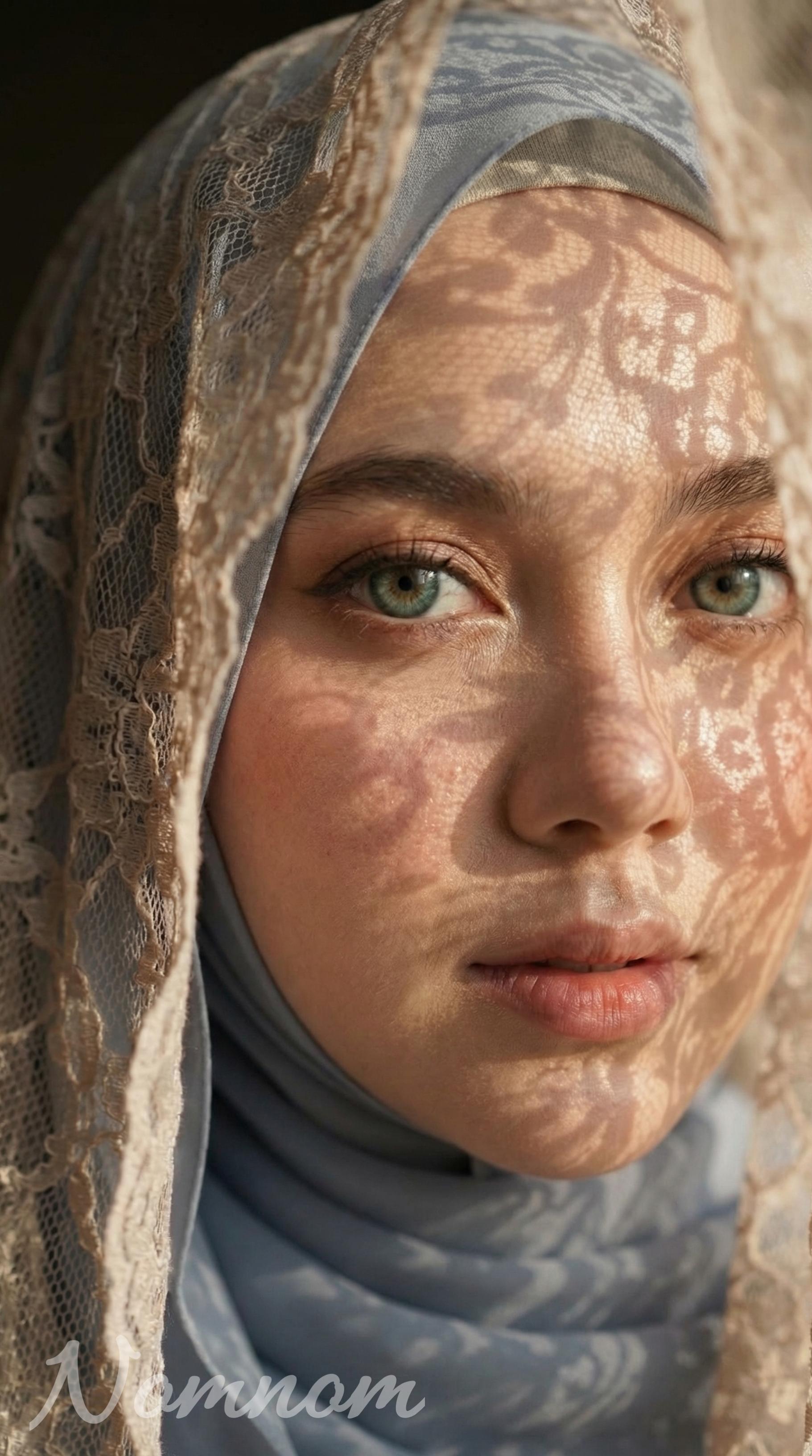 low quality, blurry, soft focus, out of focus, low resolution, jpeg artifacts, oversharpen, noise, grain, cartoon, anime, illustration, CGI, 3D render look, unrealistic skin, plastic skin, waxy face, overexposed, underexposed, bad lighting, flat lighting, distorted face, altered face, different face, wrong identity, extra limbs, extra fingers, mutated hands, bad anatomy, bad proportions, deformed body, unrealistic clothing, modern clothing, revealing outfit, tight clothes, transparent fabric, messy hijab, incorrect hijab, uncovered hair, text errors, misspelled necklace engraving, watermark, logo