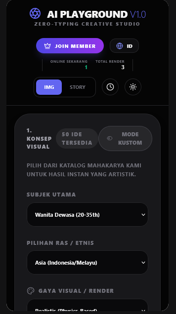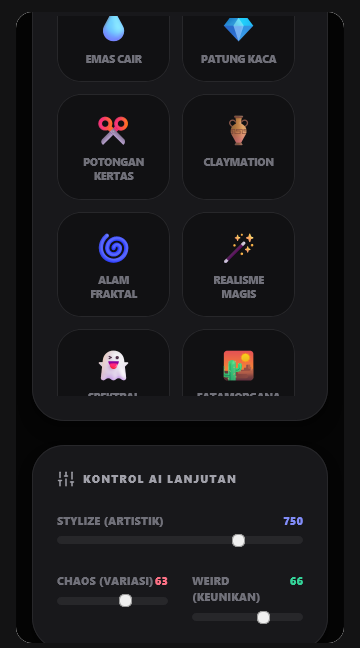 1. Katalog Mahakarya (50+ Ide Visual) Lupakan layar kosong. Tersedia lebih dari 50 katalog ide siap pakai, mulai dari estetika Cyberpunk, Studio Ghibli Style, Steampunk, hingga Dark Fantasy. Cukup pilih ikonnya, dan sistem akan merangkai konsep visual untuk Anda.