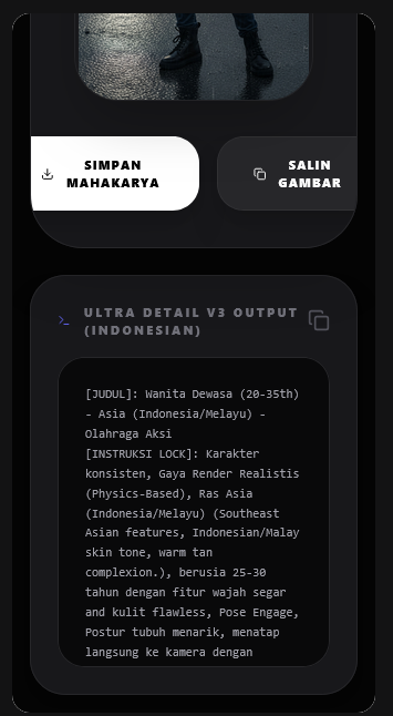 4. Output Ultra Detail V3 Setiap render menghasilkan output dalam format Ultra Detail V3 (Indonesian & English). Prompt ini dirancang khusus agar kompatibel dengan model AI lain seperti Midjourney atau Gemini, memberikan Anda aset teks yang sangat kuat untuk pengembangan karya lebih lanjut.