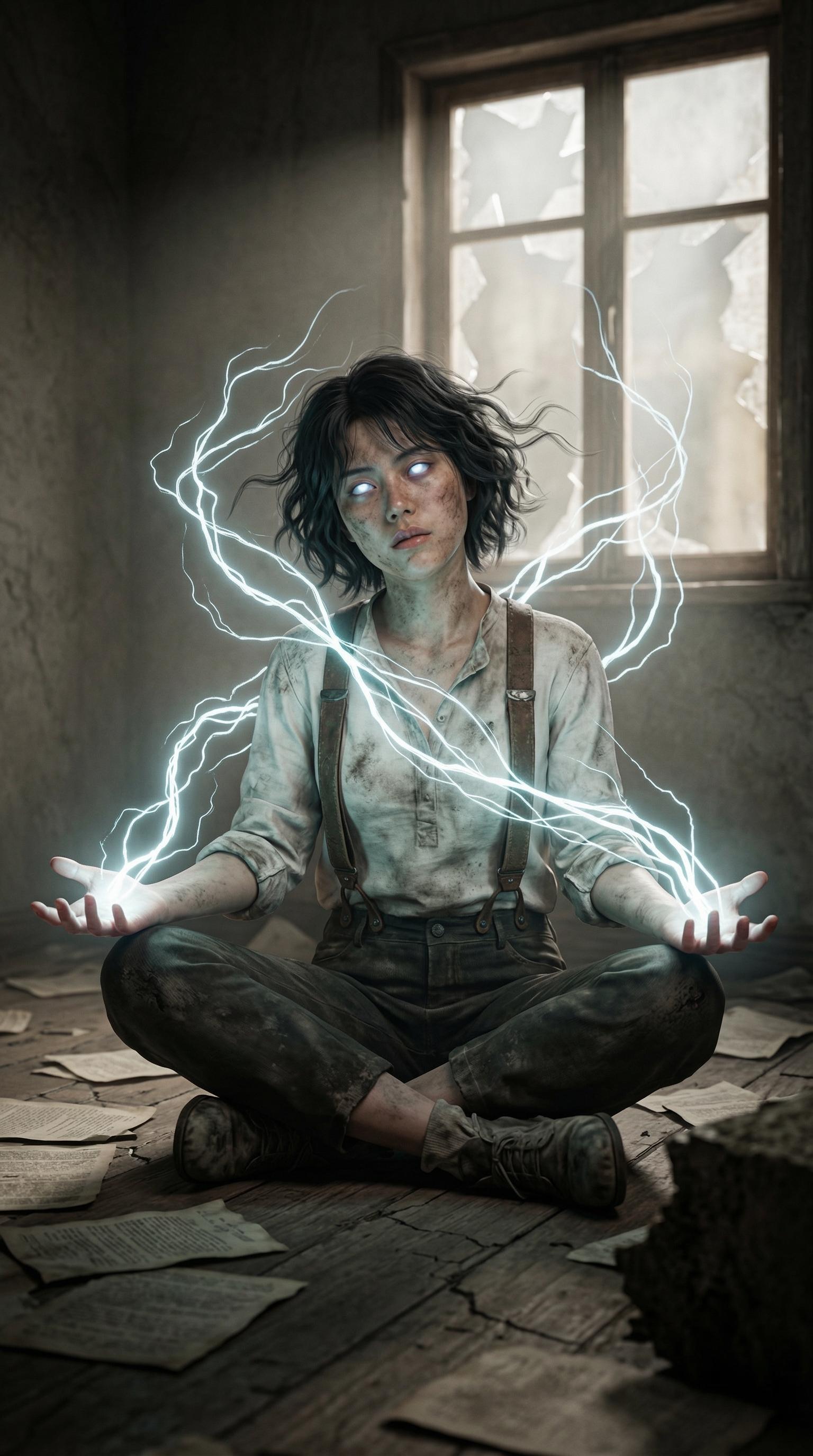 Potret ilustrasi dark fantasy dan concept art dari seorang wanita duduk bersila di lantai kayu sebuah ruangan reruntuhan yang berdebu. Posenya asimetris dengan kepala sedikit miring (tilt) ke kanan subjek, dan kedua lengan terentang ke samping dengan telapak tangan terbuka menghadap ke atas. Mata anak itu bersinar putih menyala tanpa pupil (glowing pupilless eyes). Rambutnya bergelombang kusam, berantakan, dengan helai-helai tipis (wispy strands) yang tampak melayang merespons gaya statis energi. Kulit wajahnya kotor oleh noda tanah dan debu, dengan efek subsurface scattering (SSS) yang menangkap pendaran cahaya magis. Dia mengenakan kemeja kusam berwarna putih kotor dengan lengan digulung, celana panjang gelap yang kotor, sepatu usang yang dibalut kain, dan suspender kulit cokelat tebal dengan efek weathering (aus).