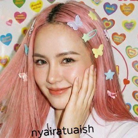 KOSTUM & FASHION: Pakaian gaya Y2K bernuansa warna pastel merah muda (pink) dan hijau mint/cyan. Memakai crop top berpotongan tali tipis dengan panel warna hijau mint di bagian dada dan applique bintang besar berlapis rhinestones perak yang memantulkan cahaya. Rok mini merah muda dengan sabuk hijau mint bergesper perak dan jahitan garis bentuk bintang. Lengan kanannya dibalut manset/sleeve terpisah berwarna hijau mint panjang hingga pergelangan tangan. Aksesoris sangat ramai: kacamata berukuran besar (oversized) berbentuk bintang dengan lensa transparan merah muda dan bingkai rhinestones, anting-anting bentuk bintang menjuntai, choker hijau mint dengan gesper perak, dan kalung rantai perak berlapis dengan liontin kecil.