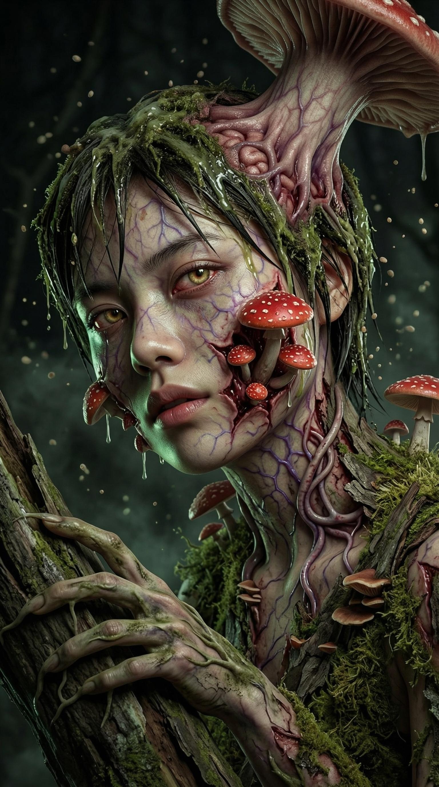 KARAKTER & ANATOMI (MUTASI MONSTER): Wajah hancur oleh infeksi parasitik (Cordyceps-style). Kulit pucat pasi yang sakit dengan jaringan urat mycelium (benang jamur) berwarna ungu kebiruan menembus lapisan dermis, menampilkan Subsurface Scattering (SSS) yang tidak sehat. Jamur-jamur Amanita muscaria merah berukuran sedang dan kecil meletus langsung dari dalam pipi, rahang, dan lehernya, merobek kulit dengan detail "jagged edges" (patahan tajam) di sekitar luka bedah organik. Mata hazel kekuningan menyala redup (glowing), sangat basah (wet eyes) dengan pembuluh darah sklera kemerahan yang menonjol, memberikan tatapan predator. Rambutnya kusut masai, menyatu sepenuhnya dengan lendir berlumut (slime) dan spora jamur yang berjatuhan.