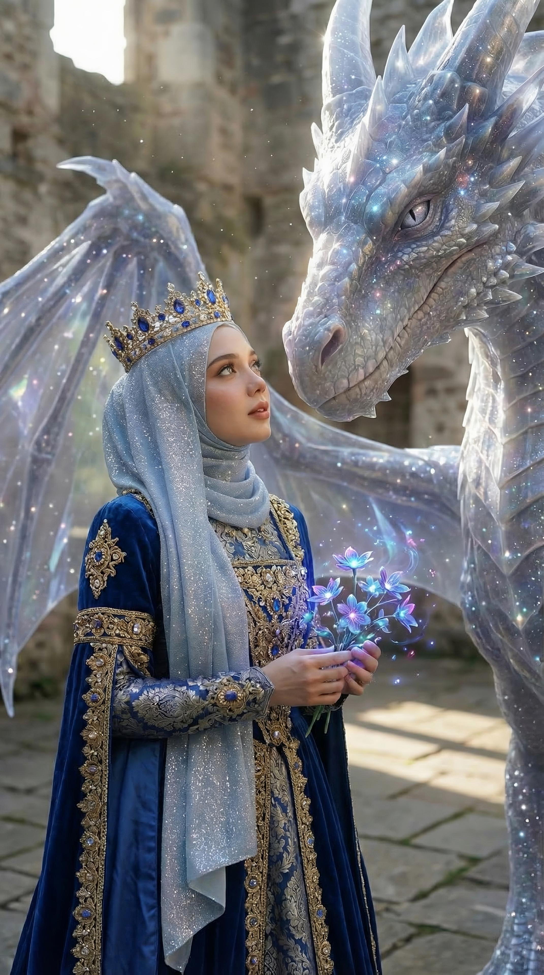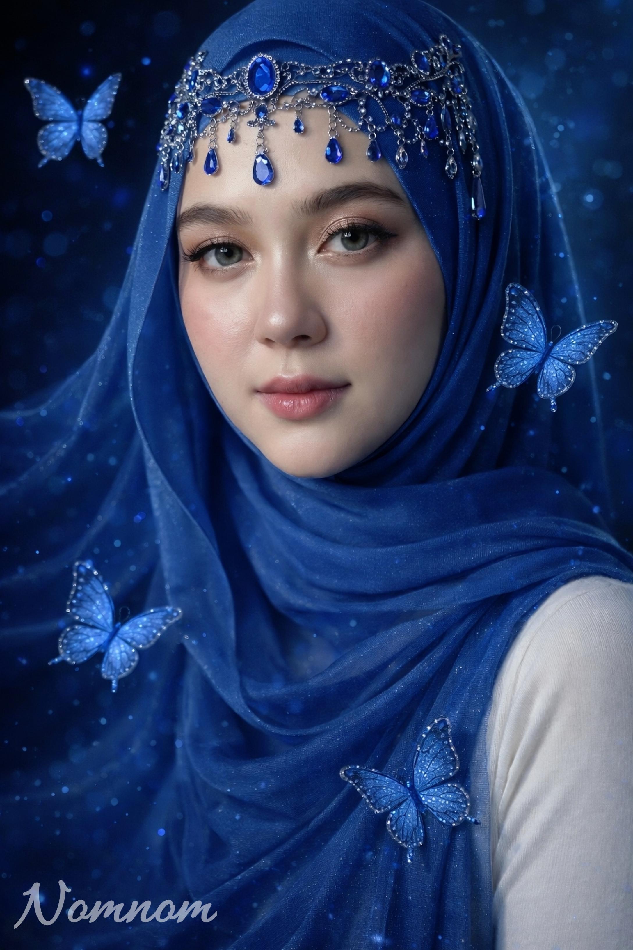 PROMPT UTAMA (9:16 – ULTRA REALISTIC) Hyper ultra-realistic professional portrait photograph, documentary realism style, true-to-life color science, UHD 8K resolution, vertical 9:16 aspect ratio, extremely detailed skin texture, visible natural pores, realistic lighting, no beauty filter, no skin smoothing. Character Lock (VERY IMPORTANT – strict identity reference): Use the uploaded reference image as the exact facial identity reference (100% face lock). Preserve the same facial structure, eye shape, nose shape, lips, skin tone, eyebrow shape, and facial proportions. Do not modify the identity. The face must remain identical to the reference image. A breathtaking close-up portrait of a beautiful young woman wearing an elegant deep sapphire blue translucent silk hijab flowing softly around her shoulders. The hijab is decorated with subtle sparkling particles and delicate glitter that catches the light. On her head is an ornate royal headpiece made of blue sapphire gemstones and delicate silver chains, with multiple teardrop sapphire crystals hanging gracefully across her forehead like a luxurious crown. Several glowing sapphire blue butterflies made of crystal and shimmering particles surround her face and rest gently on the hijab fabric. One butterfly sits near her cheek, another near her shoulder, while others softly float around her creating a magical atmosphere. Her makeup is soft natural luxury style: cool-tone eyeshadow, long natural eyelashes, subtle eyeliner, luminous realistic skin, and soft natural pink lips. Her eyes look calmly toward the camera with a serene, elegant, mysterious aura. The background is deep dark navy fading into soft blue bokeh lights, creating a dreamy magical environment. Tiny glowing blue dust particles float around her like magical sparks. Lighting setup: soft professional key light from front-left, subtle rim light from behind highlighting the translucent hijab texture, gentle cool blue ambient glow reflecting from the butterflies, high dynamic range lighting, studio portrait lighting. Camera settings: 85mm portrait lens, f/1.8 aperture, shallow depth of field, ISO 100, ultra sharp focus on eyes, cinematic bokeh background, professional studio photography. Style: ultra photorealistic portrait photography, luxury fantasy fashion, mystical elegance, extremely detailed, natural skin realism. NEGATIVE PROMPT cartoon, anime, illustration, 3D render, CGI look, plastic skin, over smooth skin, unrealistic face, altered identity, different face, low resolution, blurry, noise, grainy, extra fingers, extra eyes, bad anatomy, distorted face, watermark, logo, text, oversaturated colors, harsh shadows, poorly drawn face #bluebutterfly