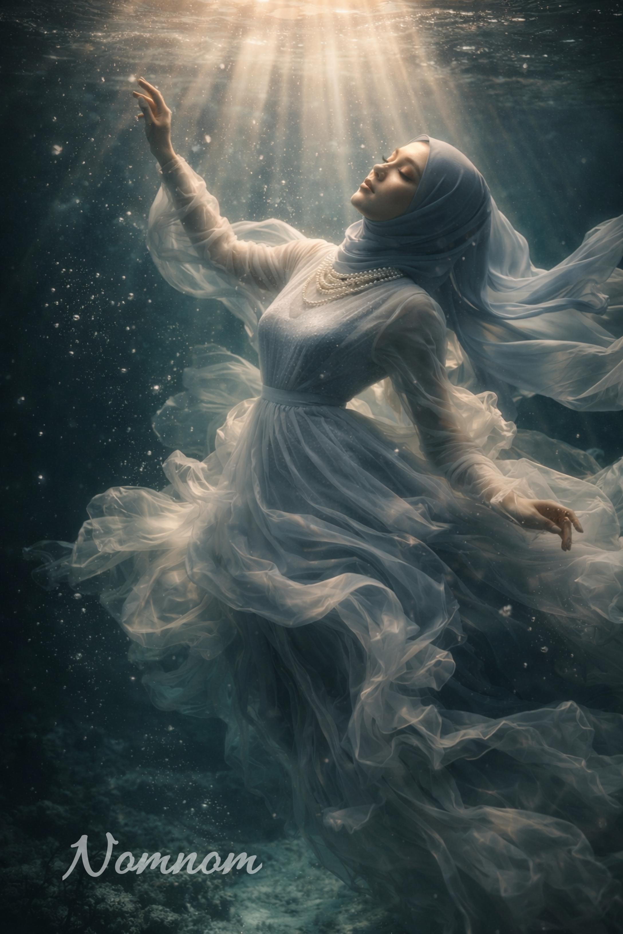 Details: She wears elegant pearl necklaces that drift upward in the water. Her hijab is long and flowing loosely upwards,caught in the gentle current. Her dress is weightless and voluminous. Her expression is serious.